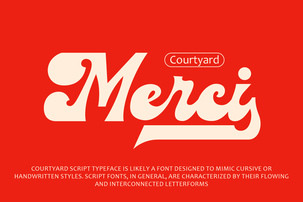 Courtyard script typeface is likely a font designed to mimic cursive or handwritten styles. Script fonts, in general, are characterized by their flowing and interconnected letterforms, resembling natural handwriting. Here are some features and potential attributes: